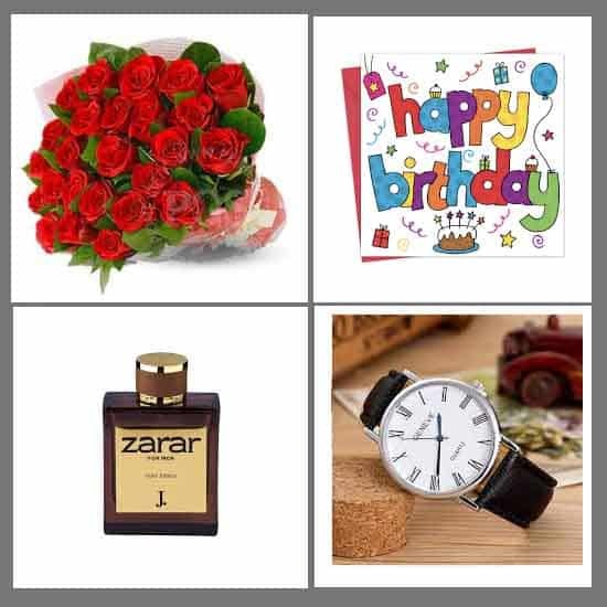 Product Details: Men’s Watch: A classic timepiece that adds sophistication to any outfit. Zaraar Gold Perfume: Experience luxury with this captivating fragrance, perfect for the modern gentleman. 2 Dozen Red Roses: A timeless symbol of love and appreciation, beautifully arranged to impress. Birthday Card: Personalize your gift with a heartfelt message.