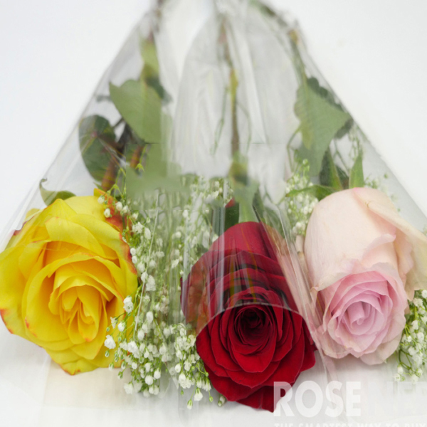 • A hand-tied bouquet of Yellow, Red & Pink Imported Roses (arranged for your event)